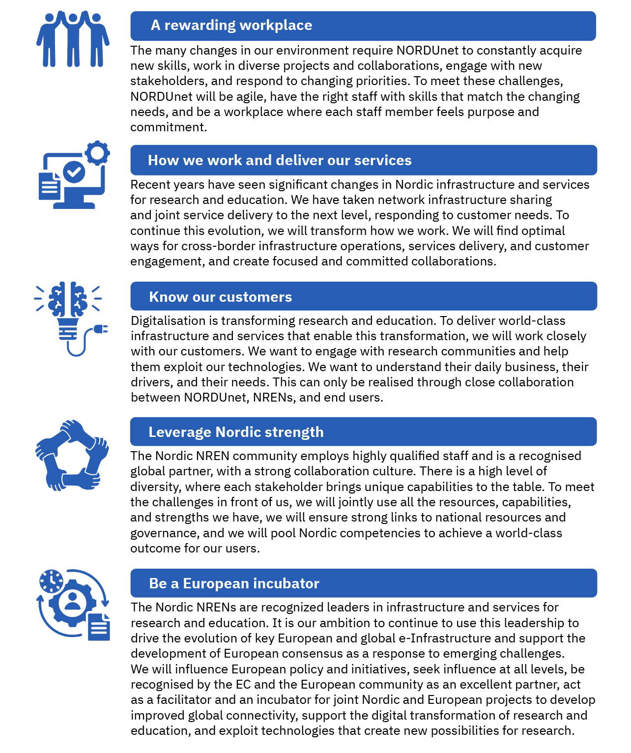 We focus on leading with ideas and action, on influencing decision makers, and on driving the evolution of key European e-Infrastructures and services. We will exploit all our Nordic strengths, and support communities and joint actions to achieve leadership. To achieve our goals together, we will be mindful of developing the culture of both NORDUnet as well as the Nordic NREN collaboration culture.